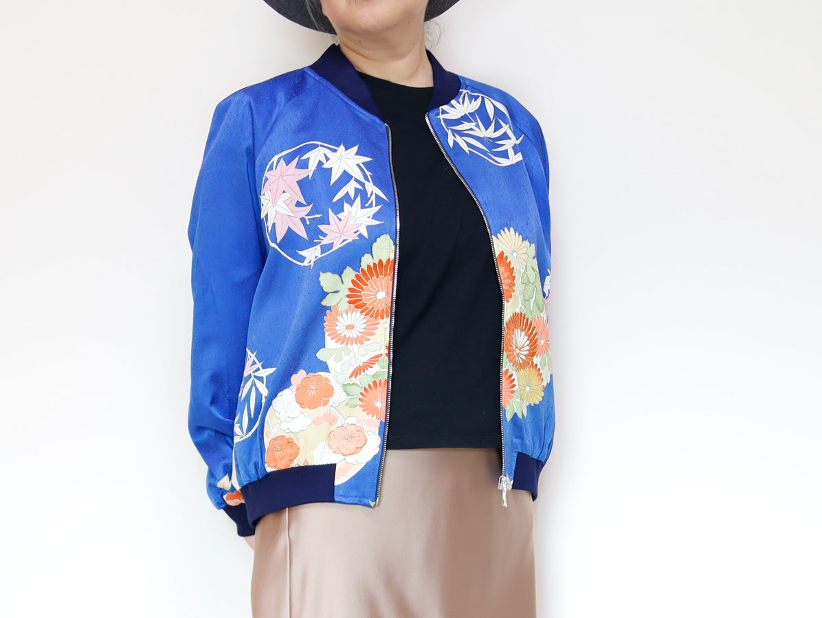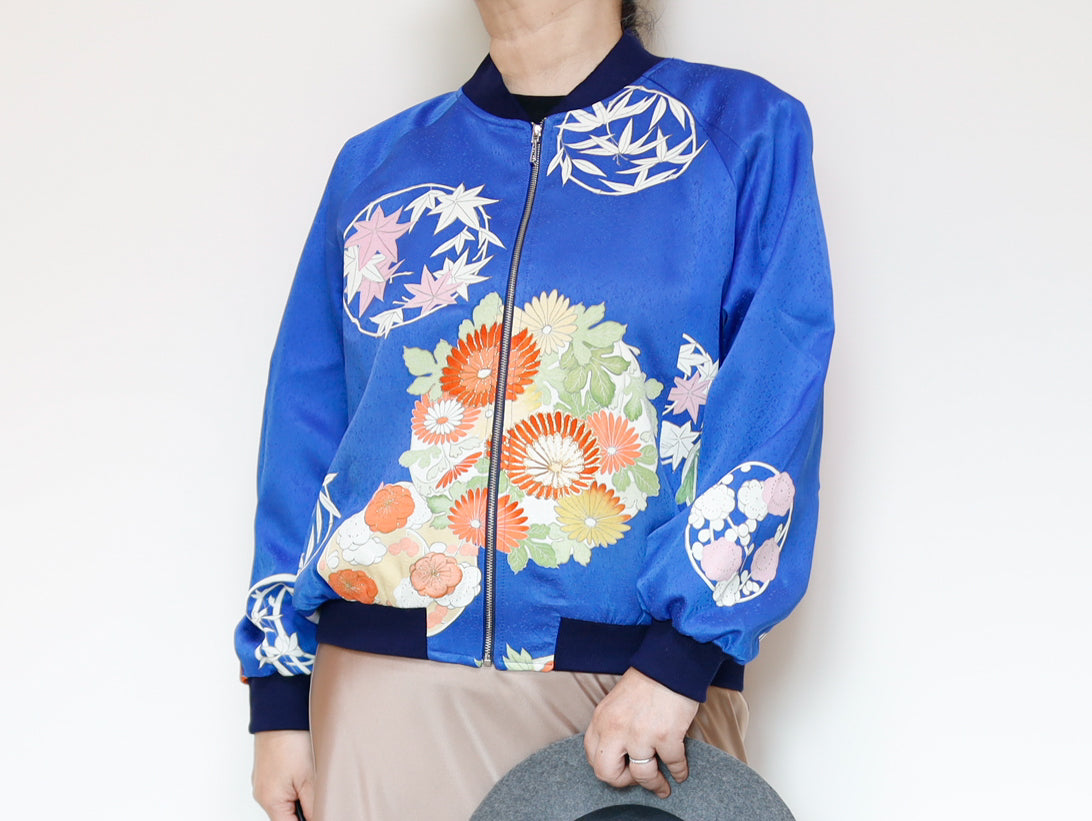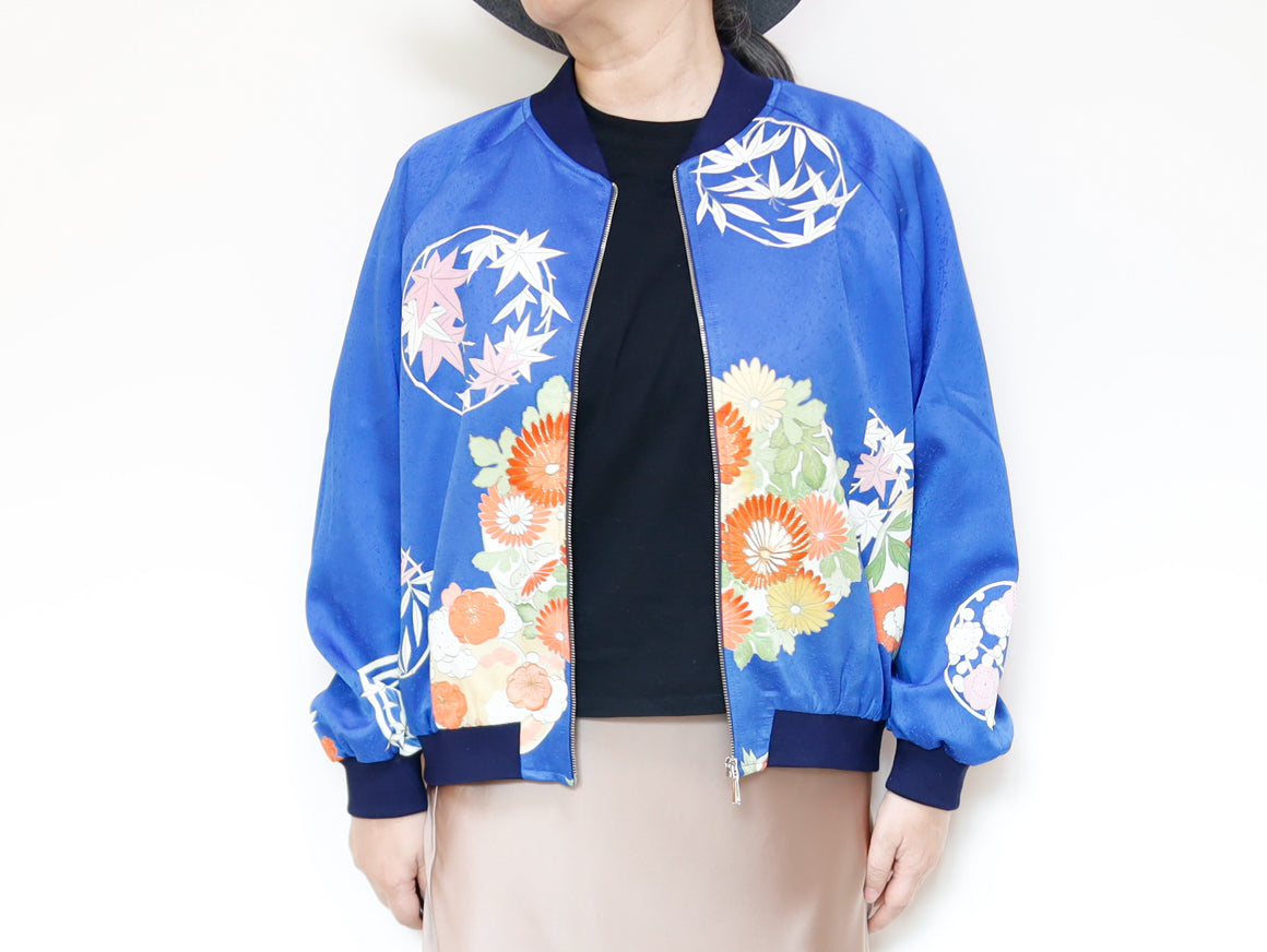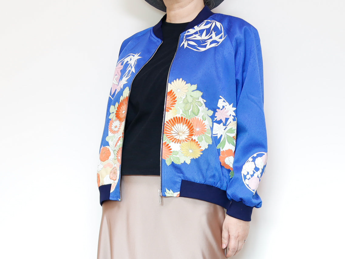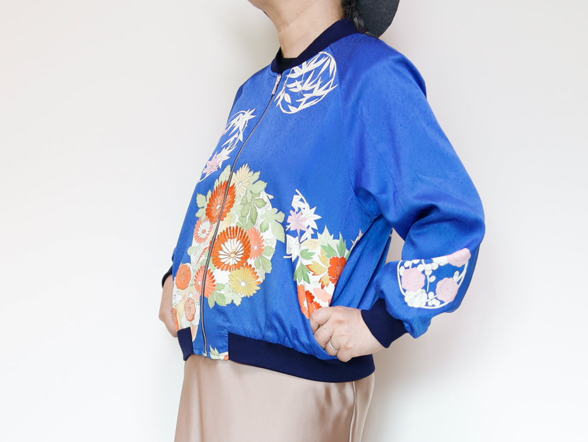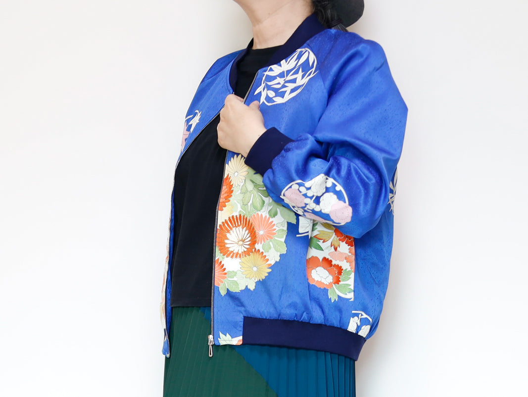 このジャケットは、鮮やかな青色の生地に、華やかな花柄の刺繍が施されています。伝統的な和の美しさと現代的なデザインが見事に融合した一着で、どんなスタイルにも合わせやすいのが魅力です。このジャケットは、古き良き日本の美を現代的なスタイルへと再解釈した、まさにアートのような存在感を持っています。精緻な刺繍によって、一つ一つの花がまるで生きているかのように艶やかに表現されています。そして、軽やかなサテンの素材感が着る人を優雅に包み込みます。