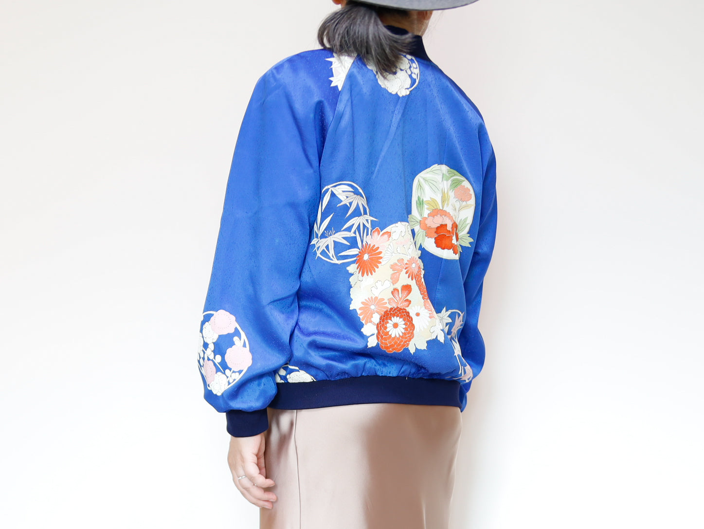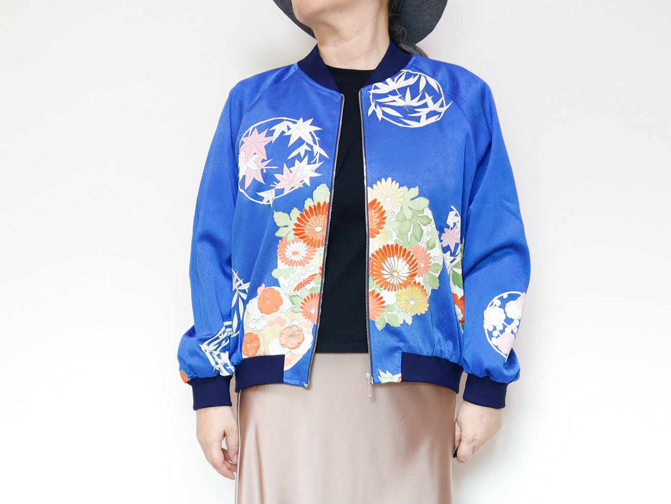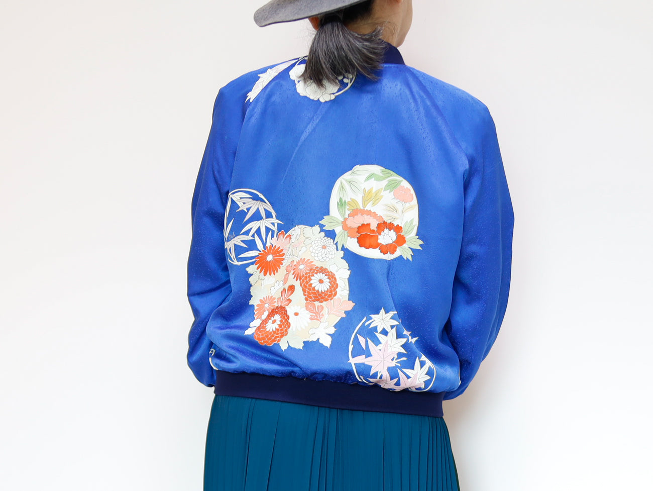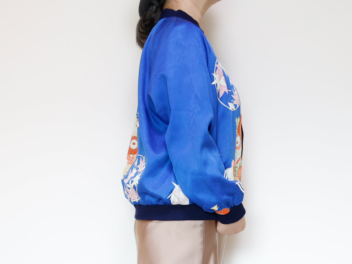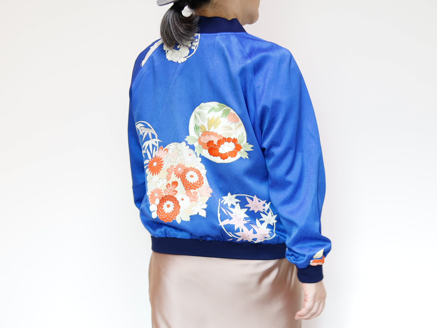 このジャケットは、鮮やかな青色の生地に、華やかな花柄の刺繍が施されています。伝統的な和の美しさと現代的なデザインが見事に融合した一着で、どんなスタイルにも合わせやすいのが魅力です。このジャケットは、古き良き日本の美を現代的なスタイルへと再解釈した、まさにアートのような存在感を持っています。精緻な刺繍によって、一つ一つの花がまるで生きているかのように艶やかに表現されています。そして、軽やかなサテンの素材感が着る人を優雅に包み込みます。