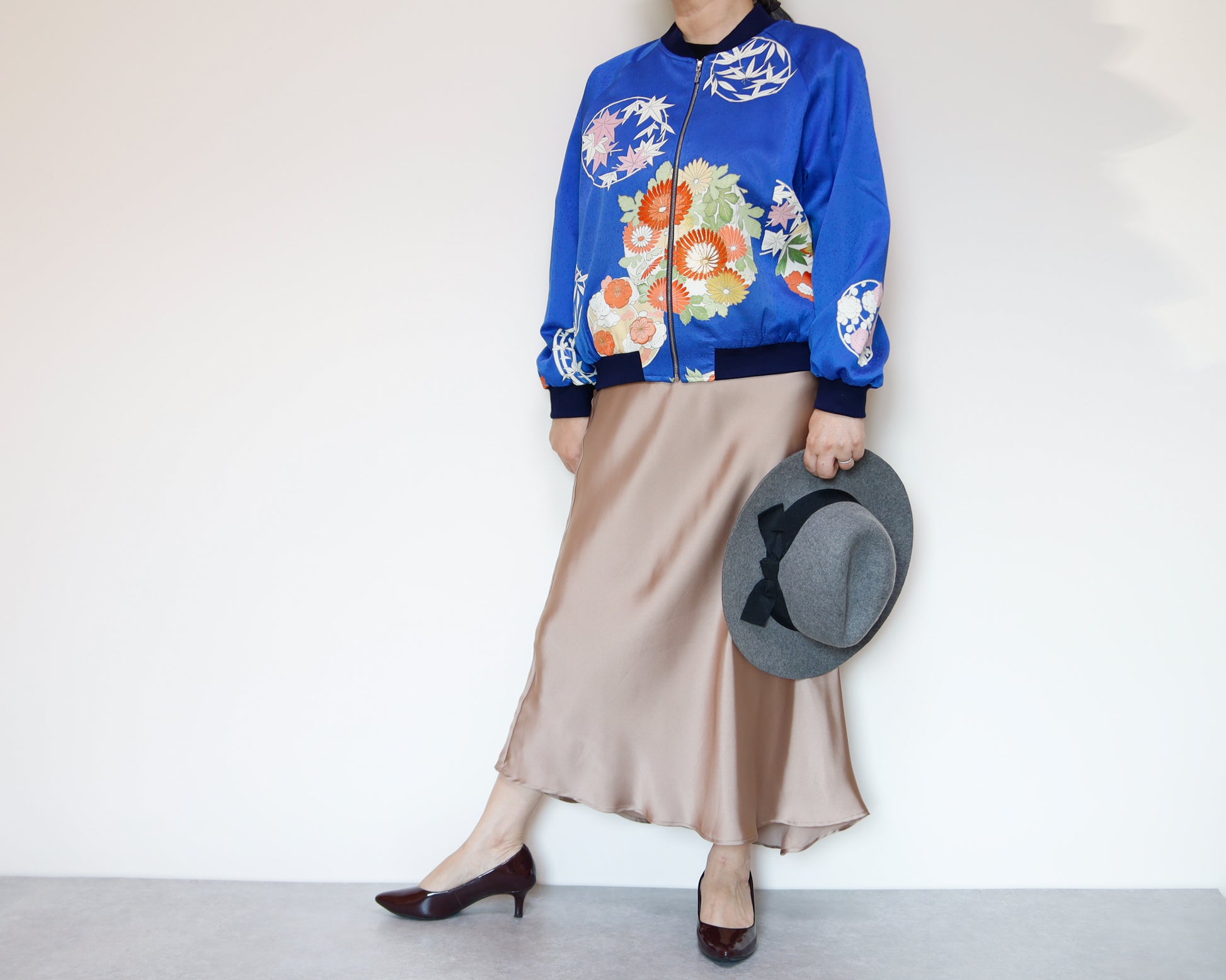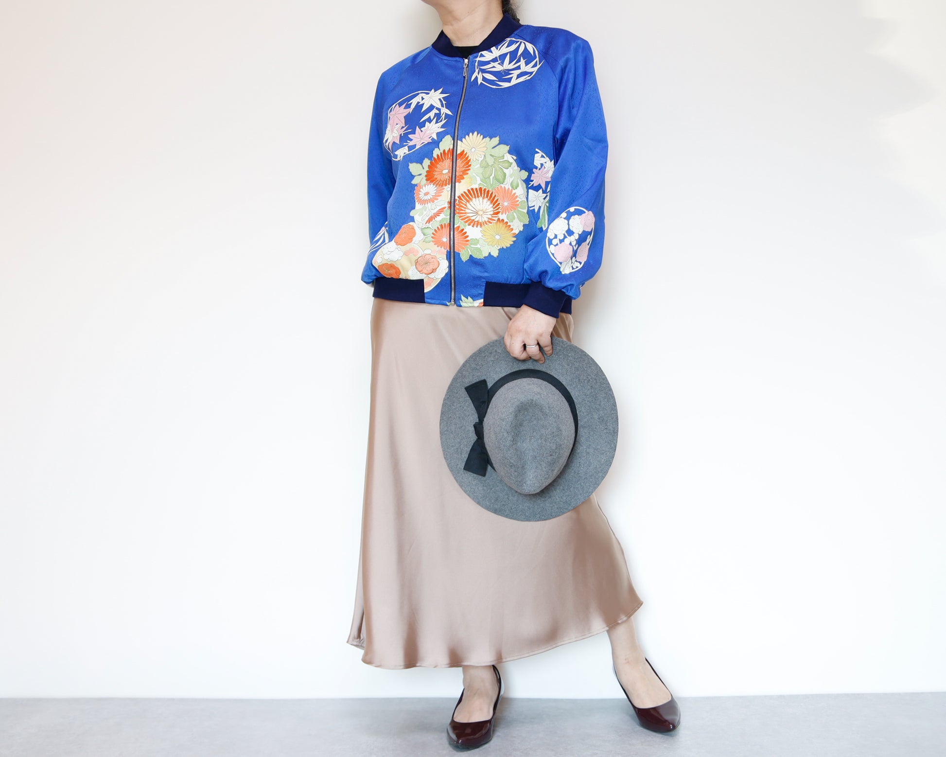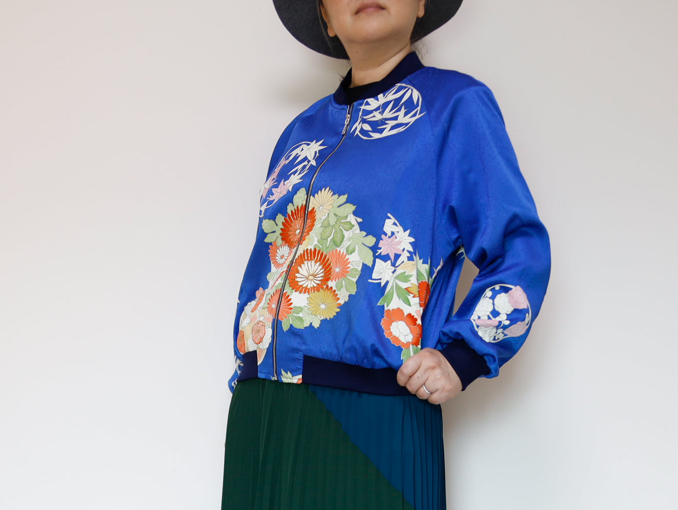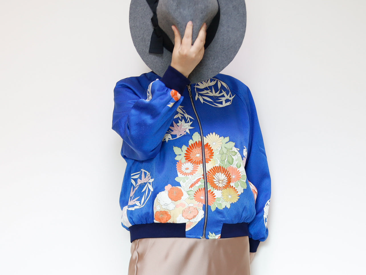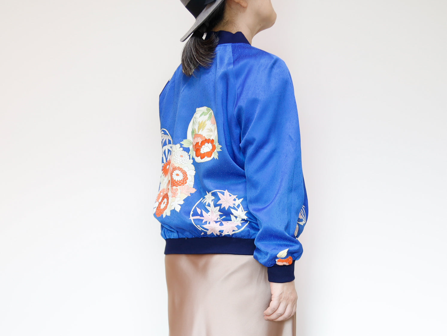 このジャケットは、鮮やかな青色の生地に、華やかな花柄の刺繍が施されています。伝統的な和の美しさと現代的なデザインが見事に融合した一着で、どんなスタイルにも合わせやすいのが魅力です。このジャケットは、古き良き日本の美を現代的なスタイルへと再解釈した、まさにアートのような存在感を持っています。精緻な刺繍によって、一つ一つの花がまるで生きているかのように艶やかに表現されています。そして、軽やかなサテンの素材感が着る人を優雅に包み込みます。