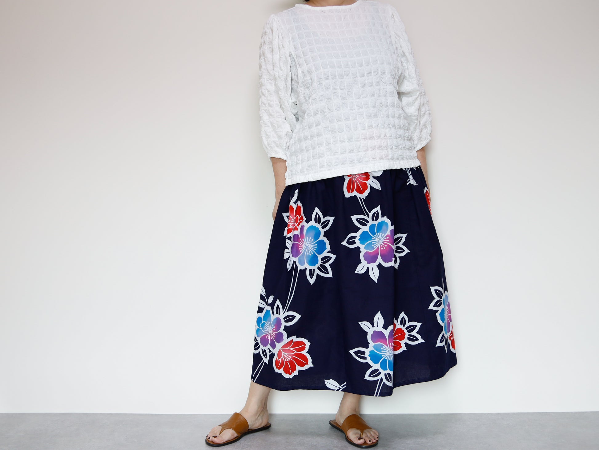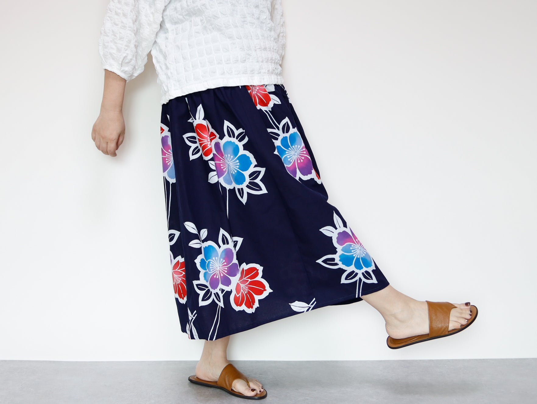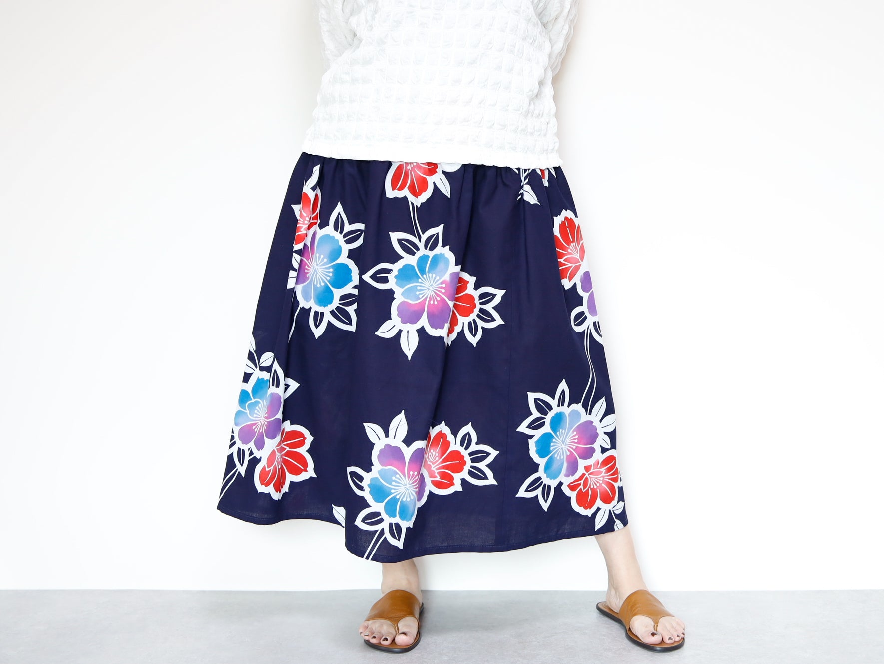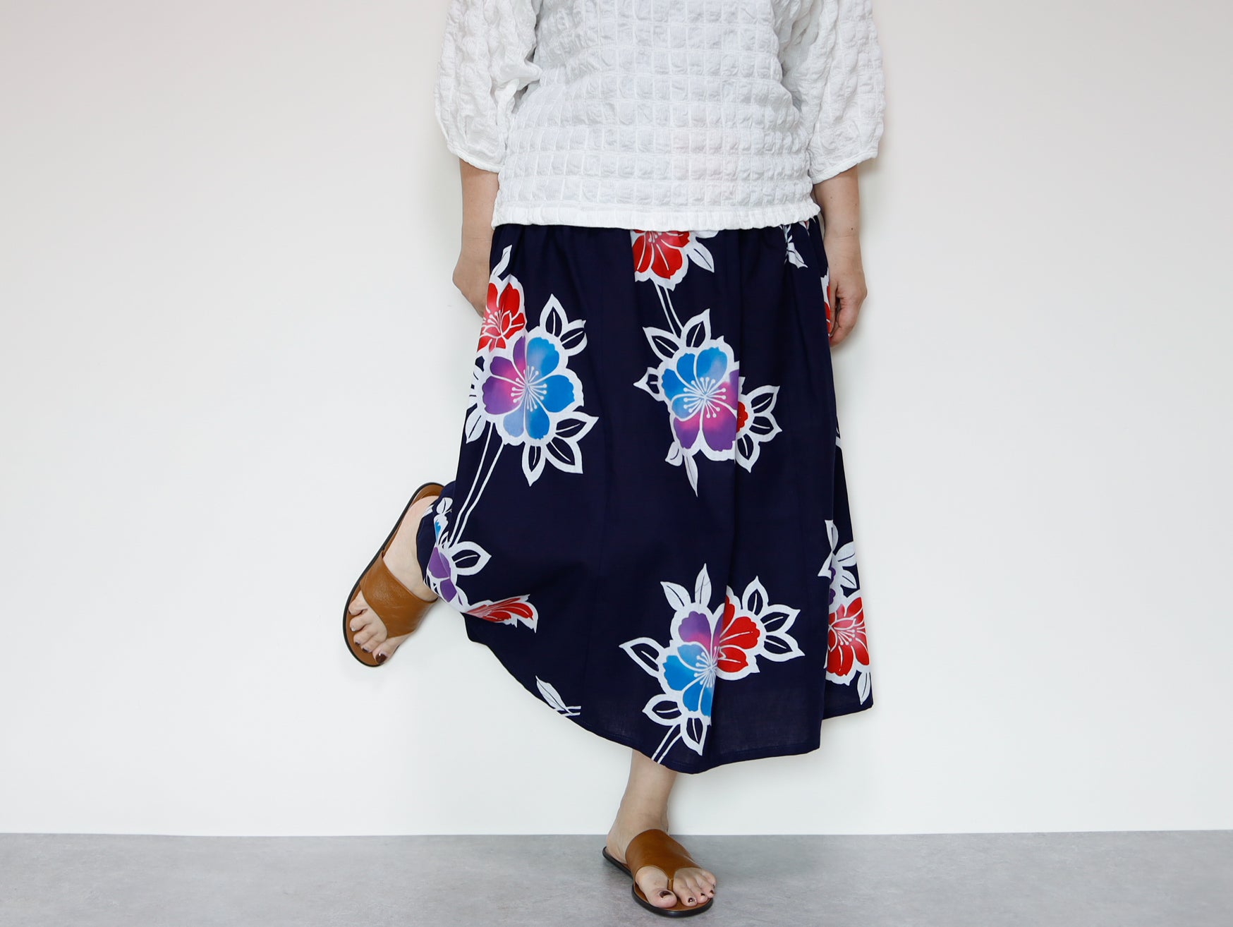 OKINAWAスカートは、日本の伝統的な浴衣生地を使用し、日常のファッションに取り入れやすいデザインに仕上げられたアイテムです。
