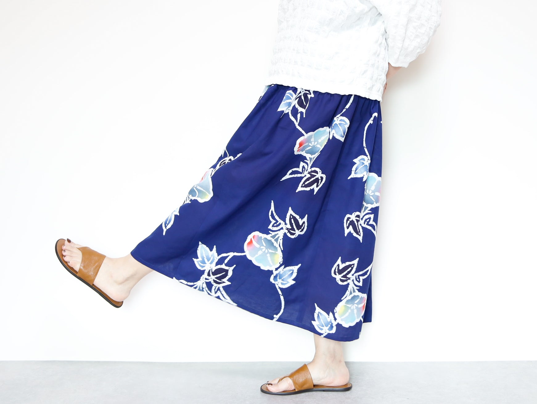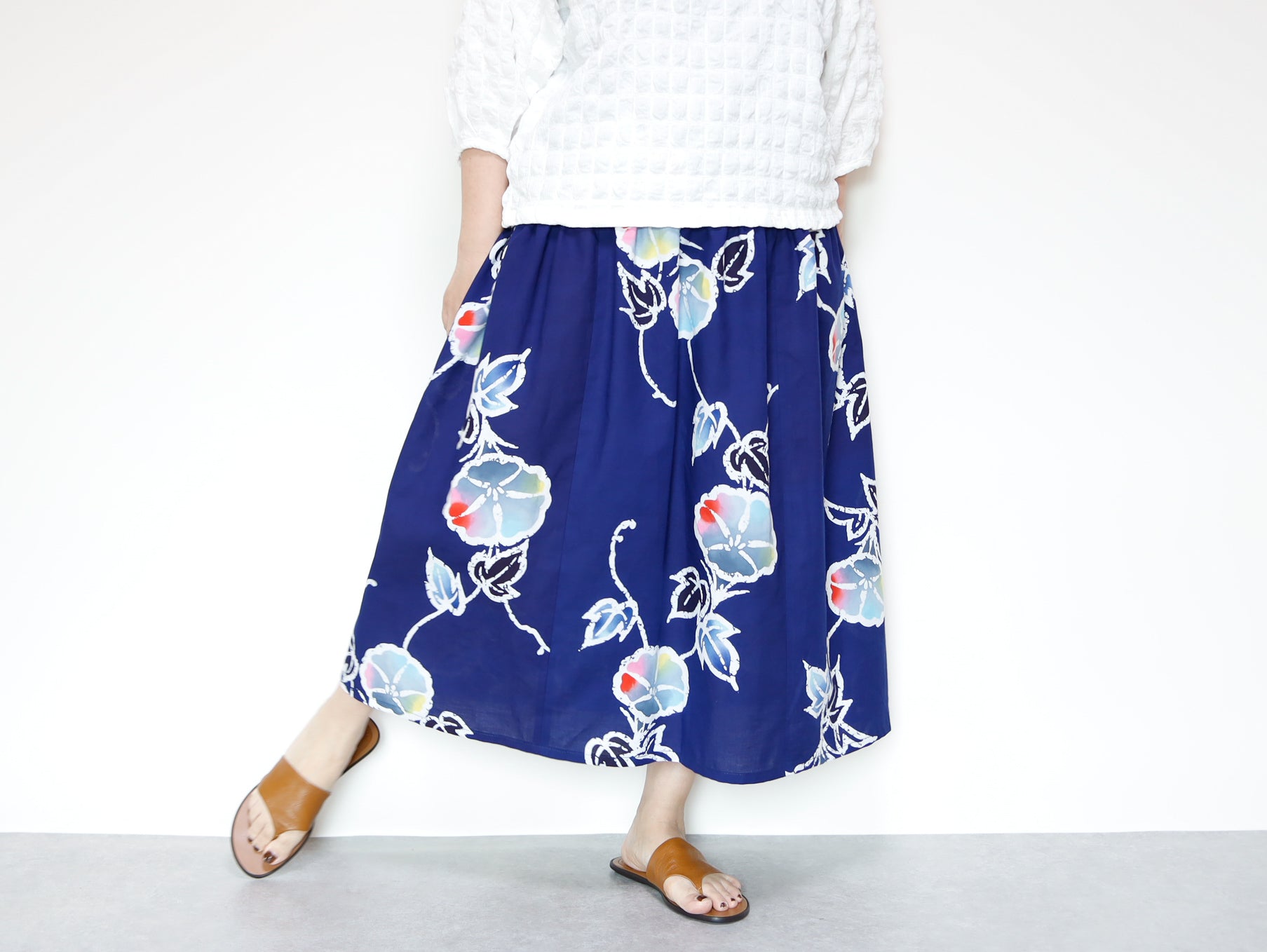 OKINAWAスカートは、日本の伝統的な浴衣生地を使用し、日常のファッションに取り入れやすいデザインに仕上げられたアイテムです。