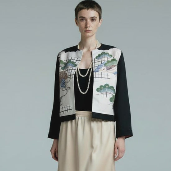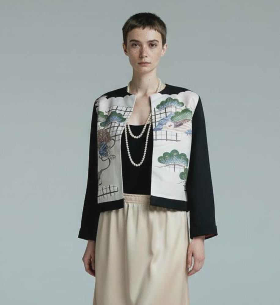 The delicate brushstrokes of the landscape painting, the depth of colors, and the unique texture – this jacket encapsulates the allure of vintage kimono.