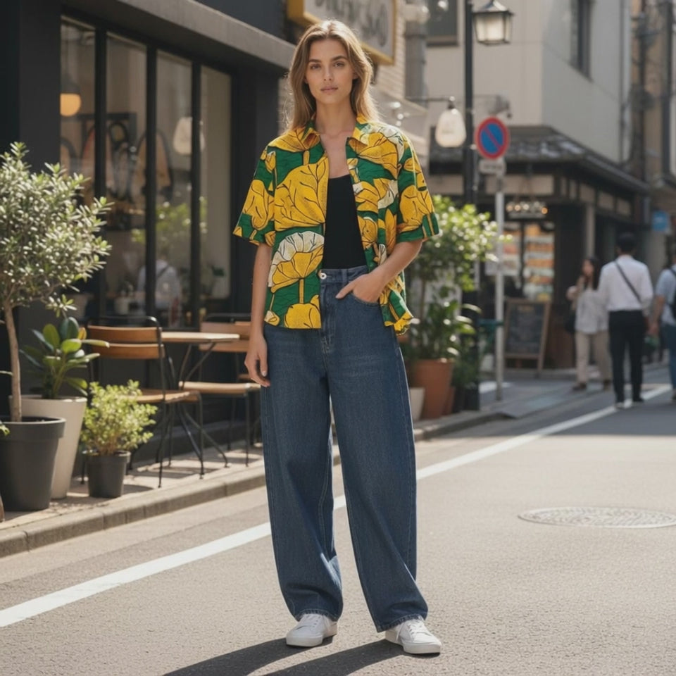 Bringing the vibrant energy of Africa into your everyday wardrobe, this yellow leaf-print shirt is designed to brighten your mood the moment you put it on.